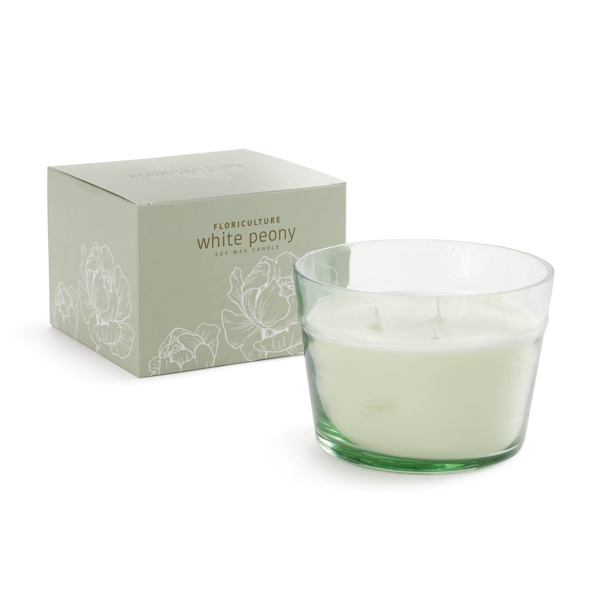Created by gardeners for gardeners, Floriculture is a line of subtle, fragrant candles that celebrate the artistry of growing things. White Peony is soft oriental blooms atop fresh green stems mixed with a sweet rose musk. Retailing under $30. 5 x 5 x 3.5, Box: 5.25 x 5.25 x 3.75. Never leave a burning candle unattended. Do not touch glass during use or until candle has cooled. Keep away from children and pets. See more care & use on bottom of candle.