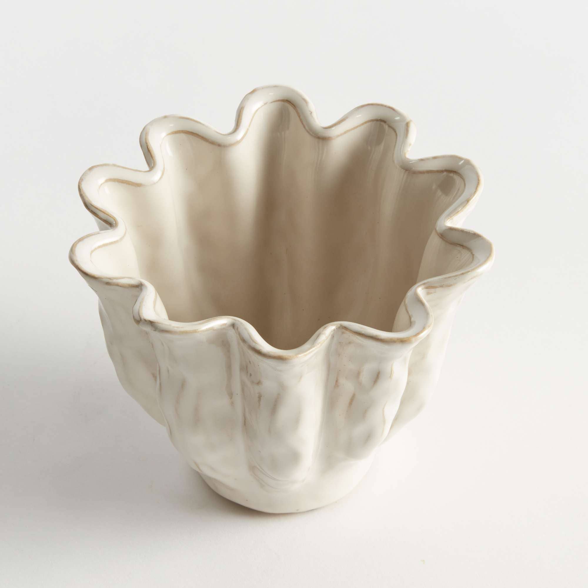 The Lillian Pot SM in Antique White is a stunning ceramic cachepot that interior designers and specialty retailers will find irresistible. With its unique artisan-made slip cast design, this pot features a delicate scalloped edge that draws the eye and adds a touch of elegance to any space. The antique white glaze, with its organic variations, ensures that each piece is one-of-a-kind, making it a perfect choice for those seeking individuality in their decor. Measuring 4" x 4" x 4.25", this versatile pot can be used as a cachepot or planted directly, thanks to its built-in drain hole. It is also outdoor safe, allowing for seamless integration into garden settings. Whether filled with vibrant blooms or used as a standalone accent, the Lillian Pot brings a natural beauty that complements any design aesthetic. Protect fine furniture by lining the interior, and enjoy the timeless appeal of this exquisite piece.