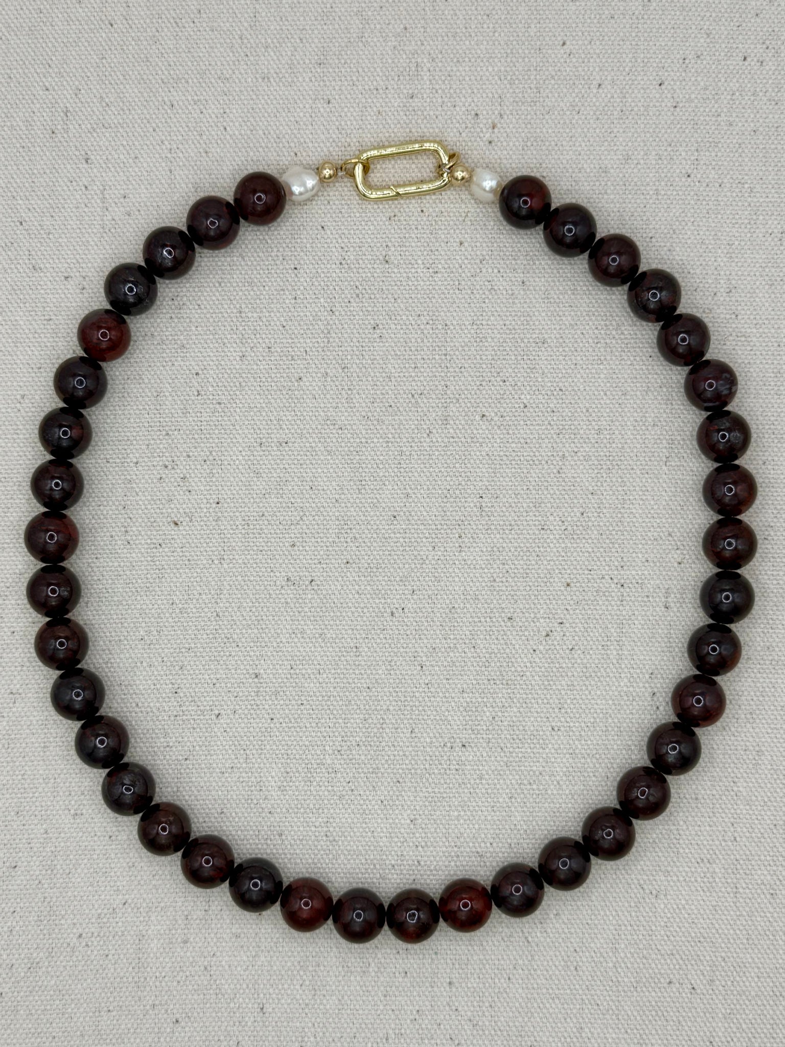Large round natural gemstones with small freshwater pearl detail. 18k gold-filled findings. Clasp is perfect to easily add charms. 16”