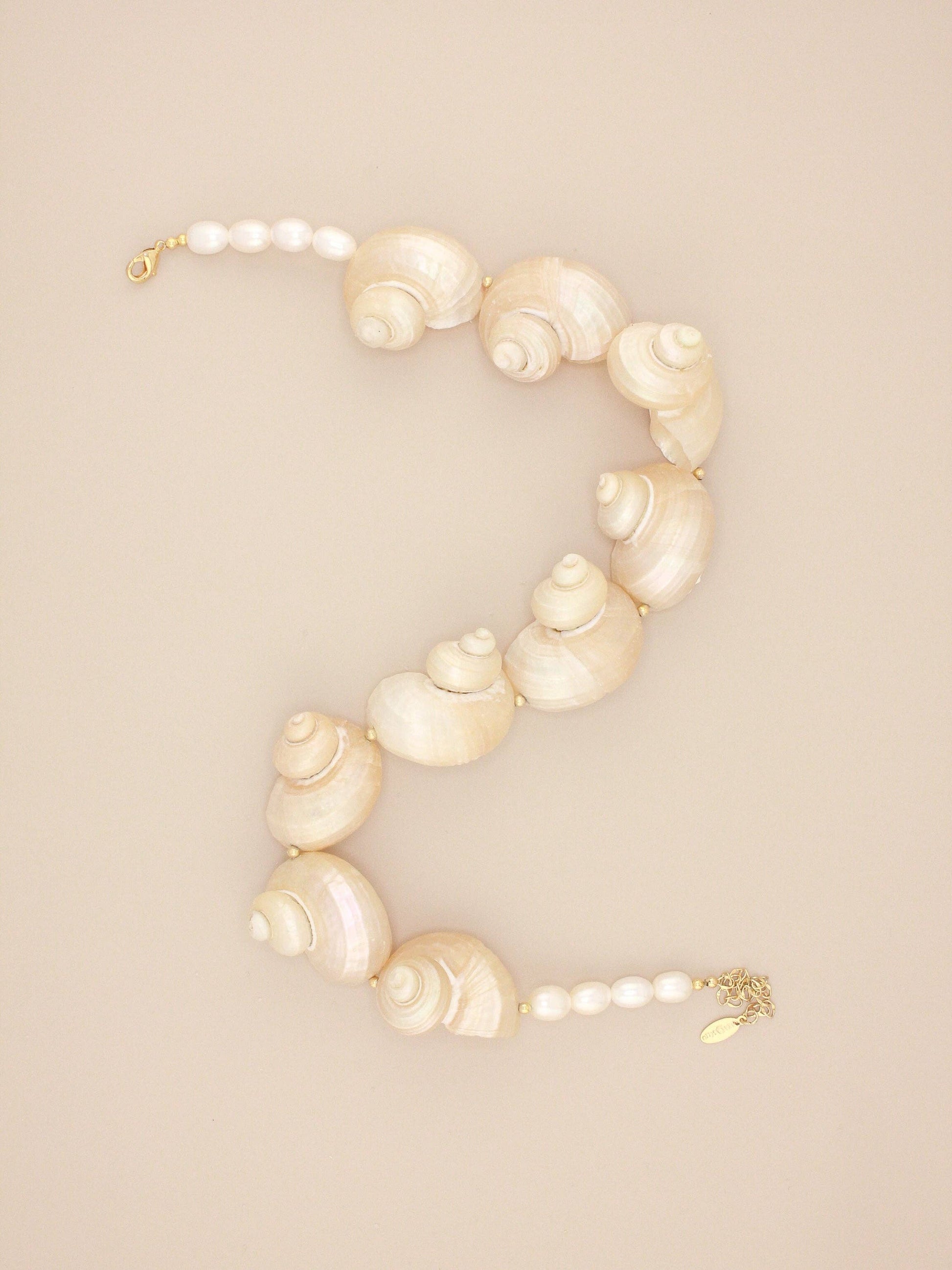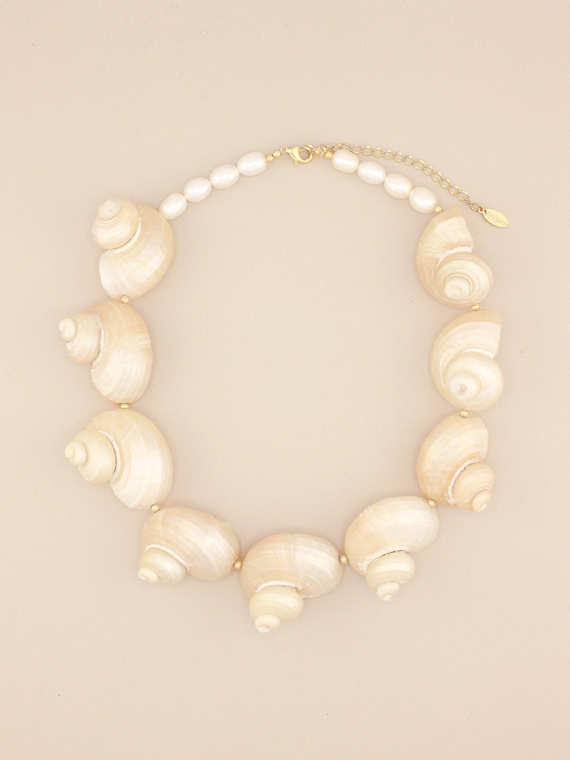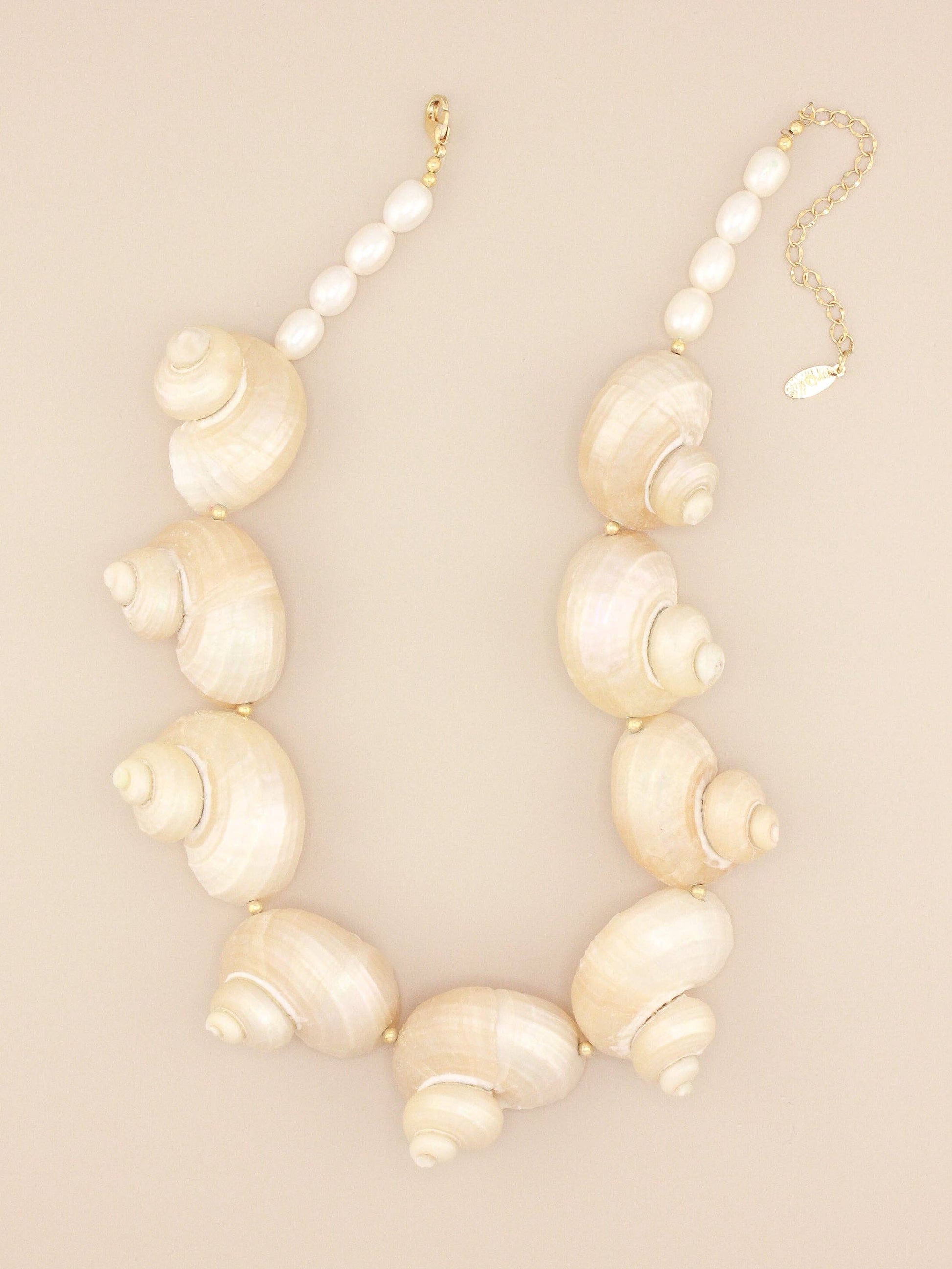 Statement shell necklace, with large turbo shell and nugget pearls.