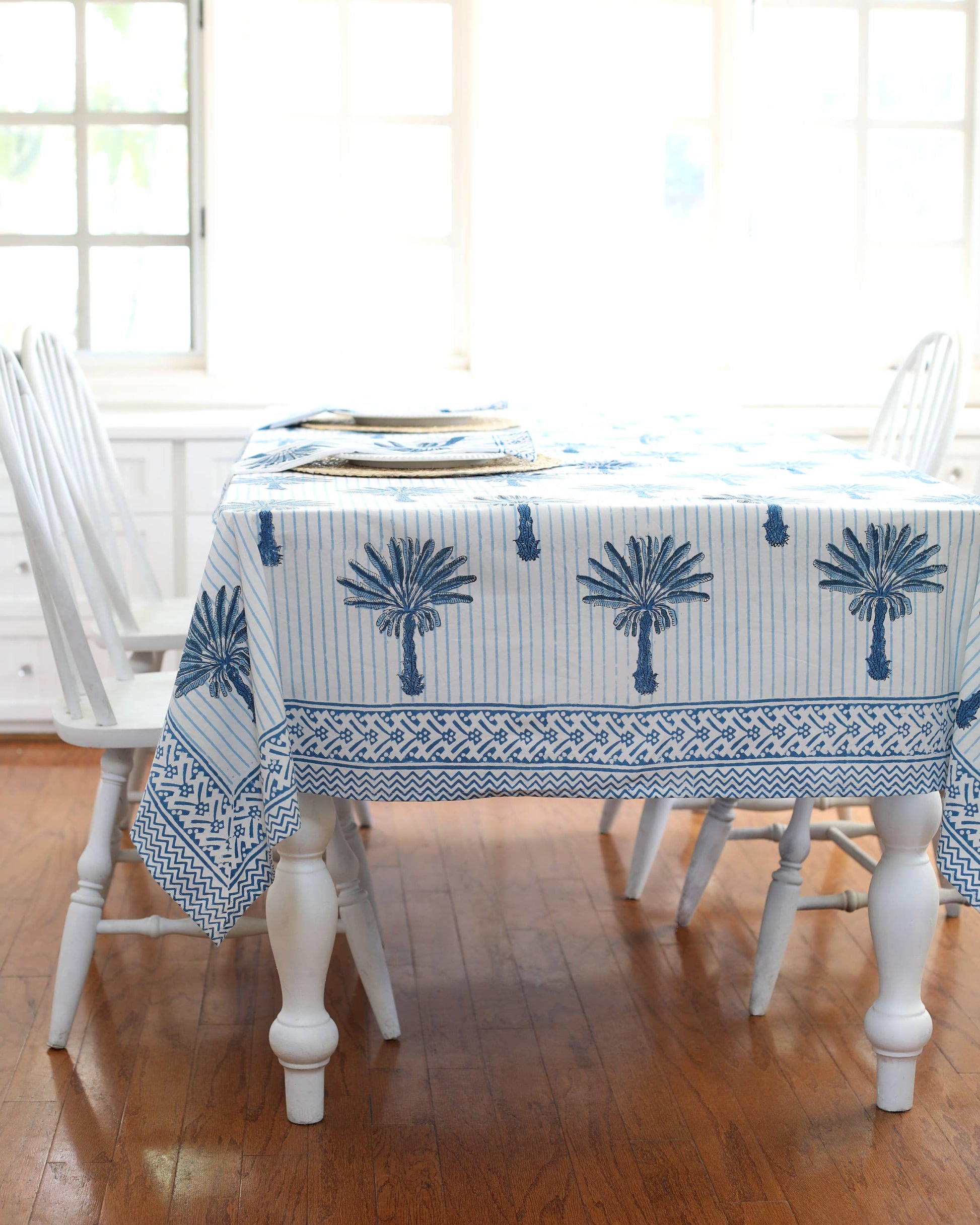 Our Palm Tree print is block-printed in coastal shades of blue with a blue stripe background.